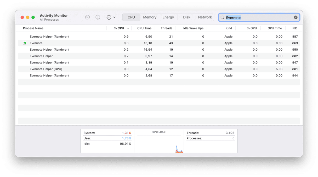 - Accédez à Applications > Utilitaires et ouvrez le moniteur d'activité. Recherchez Evernote. Si des processus apparaissent dans les résultats, sélectionnez-les et utilisez le « x » dans la barre d’outils pour les quitter.