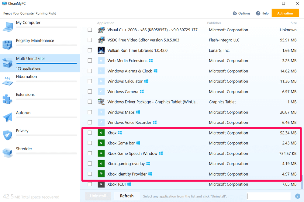 Une fois CleanMyPC installé, ouvrez le programme et choisissez « Multi Uninstaller ». Dans cette liste, l'application Xbox est effectivement répertoriée et peut être désinstallée si vous le souhaitez. Cochez simplement les cases puis appuyez sur le bouton vert « Désinstaller ».