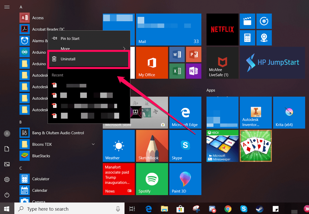 Si vous préférez ne pas fouiller dans les paramètres, vous pouvez également désinstaller directement depuis le menu Démarrer. Pour ce faire, appuyez sur la touche Windows de votre ordinateur ou cliquez sur l'icône dans le coin inférieur gauche. Vous devriez voir une liste d’applications apparaître. Cliquez avec le bouton droit sur n'importe quelle application et choisissez « Désinstaller » dans le menu déroulant.
