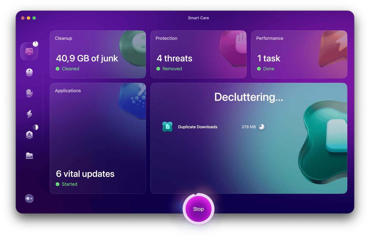 Utiliser votre Mac comme deuxième moniteur signifie qu'il est important de maintenir le bon fonctionnement de votre appareil pour éviter les ralentissements ou les surchauffes. L'outil Smart Care dansNettoyerMonMacaide à optimiser les performances en :