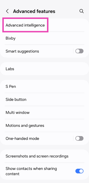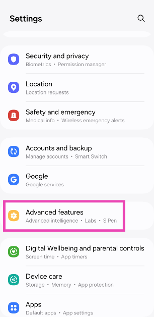 Étape 1 :Aller àParamètreset sélectionnezFonctionnalités avancées.