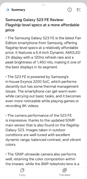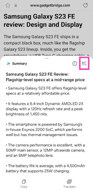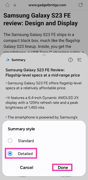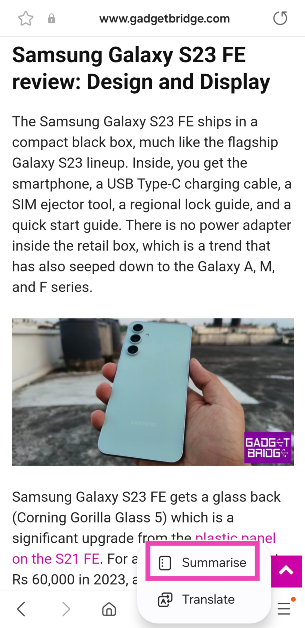 Une autre fonctionnalité intéressante de Galaxy AI est le résumé des pages Web. Si vous n'avez pas assez de temps pour lire un long article, vous pouvez cliquer sur l'icône IA et générer un résumé de la page Web. L'application de navigateur vous offre également la possibilité de générer un résumé détaillé. Vous pouvez traduire ce résumé dans la langue de votre choix.