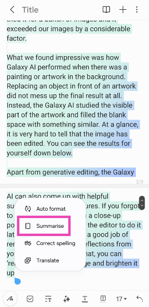 Étape 4 :Appuyez surRésumer. Vous pouvez également utiliser Galaxy AI pour formater automatiquement, vérifier l’orthographe et traduire le texte. Il existe une limite de mots pour la fonction de résumé.