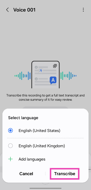 Étape 3 :Sélectionnez lelangueet frappéTranscrire. Vous devrez peut-être télécharger unpack de languepour ça.
