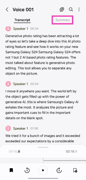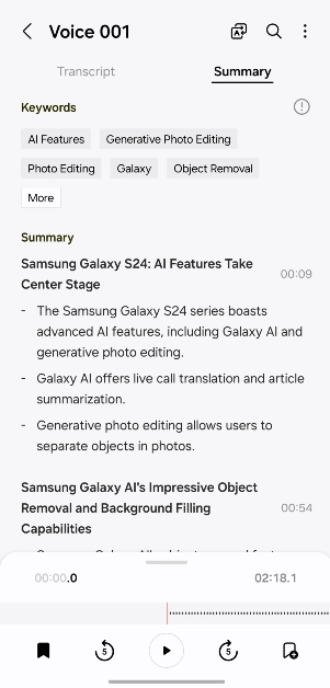 Comme les nouveaux smartphones Pixel, l’application d’enregistrement vocal native de Samsung peut désormais transcrire les notes vocales pour vous. S'il y a plusieurs intervenants sur l'enregistrement vocal, ils seront classés en conséquence. Galaxy AI fait de son mieux pour garantir qu’il n’y a pas de redondances ni d’erreurs grammaticales dans le texte transcrit. Cependant, si le discours n’est pas clairement clair, quelques erreurs parviendront à s’infiltrer. Heureusement, ces erreurs sont faciles à ignorer. Galaxy AI résume le texte transcrit pour vous et le formate de manière facile à lire. Il génère des mots-clés liés aux sujets qu’il juge importants. En appuyant sur un mot-clé, vous accédez à la partie où il est mentionné dans le texte.