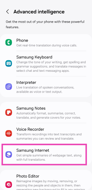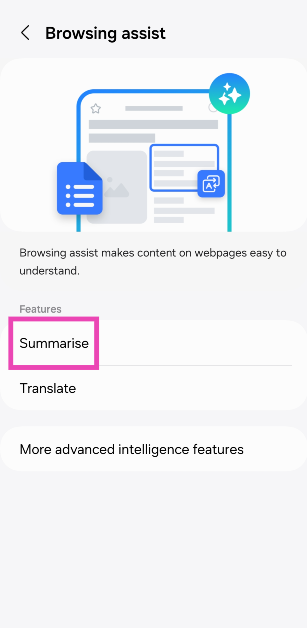 Ouvrez l'article d'actualité dans le navigateur natif de Samsung, appuyez sur l'icône Galaxy AI en bas de l'écran et appuyez sur « Résumer ».