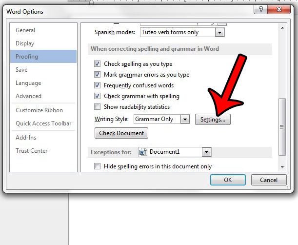 Ouvrez la fenêtre Options de vérification linguistiqueÉtape 4 : Cliquez sur leParamètresbouton à droite duStyle d'écrituremenu déroulant dans leLors de la correction de l'orthographe et de la grammaire dans Wordsection.