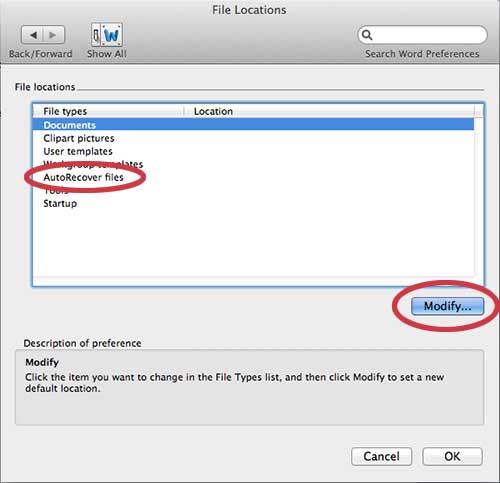 Pour certains utilisateurs, la récupération automatique peut ne pas fonctionner correctement car aucun emplacement de récupération automatique n'est défini. Vous pouvez définir manuellement un emplacement de récupération automatique en cliquant sur le boutonEmplacements des fichiersoption sur lePréférences de motsmenu,