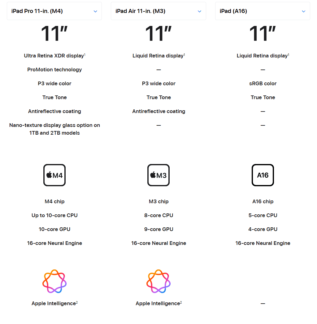 Lorsque vous choisissez entre les derniers modèles d'iPad :iPad (11e génération),iPad Air (M3), etiPad Pro (M4)- voici une description détaillée de la façon dont ils se comparent entre les fonctionnalités de base :