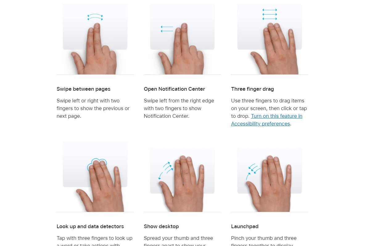 Les trackpads MacBook sont équipés de la technologie Multi-Touch, conçue pour offrir aux utilisateurs une gamme de gestes de navigation intuitifs. Ces gestes contribuent à améliorer l'expérience globale, en offrant aux utilisateurs une gamme de fonctionnalités allant de tâches simples comme appuyer pour cliquer, à des gestes plus complexes tels que pincer pour zoomer ou utiliser deux doigts pour faire défiler le contenu. Les utilisateurs peuvent personnaliser ces gestes en fonction des besoins individuels via les préférences système macOS.
