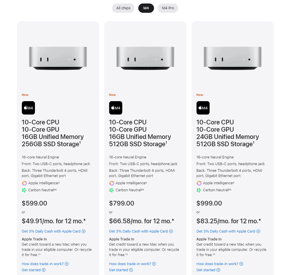 Quelle est la fourchette de prix pour les différentes configurations du Mac mini M4 ?