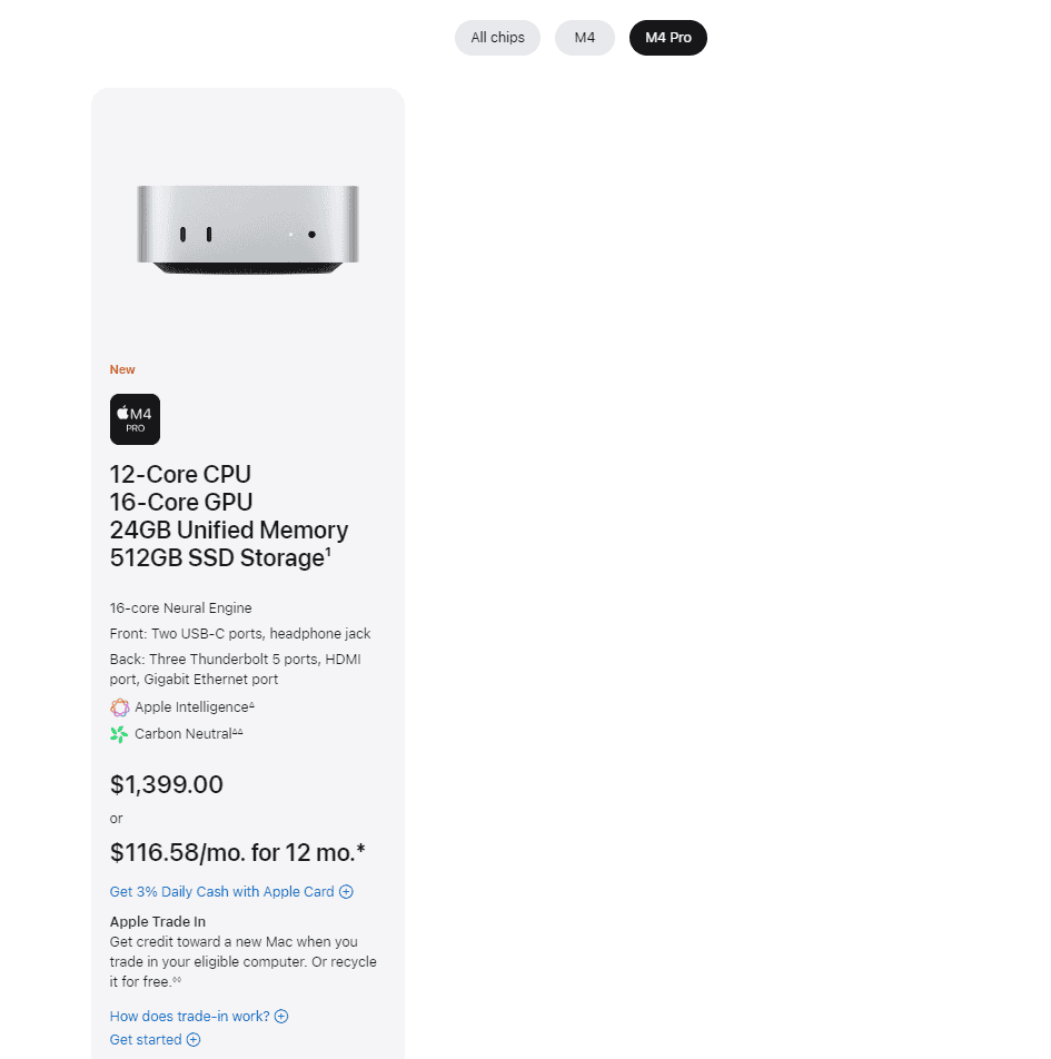 Pour ceux qui ont besoin d’encore plus de performances, Apple propose une variante M4 Pro du Mac mini. Cette version est livrée avec un processeur à 14 cœurs et un GPU à 20 cœurs, offrant des capacités améliorées pour les tâches exigeantes. Le modèle M4 Pro prend également en charge jusqu'à 64 Go de RAM, tandis que la version standard M4 atteint un maximum de 32 Go, s'adressant aux utilisateurs ayant des besoins de mémoire variables.