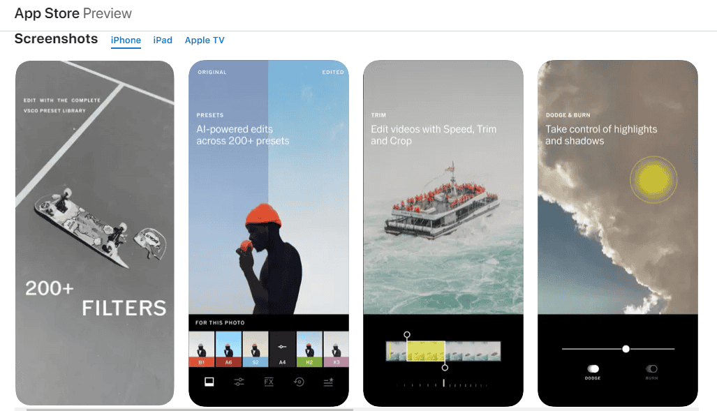 - VSCO :Connu pour sa vaste collection de filtres et préréglages artistiques, VSCO est un excellent choix pour ajouter une touche unique à vos photos. Il propose également des outils d'édition avancés et une plateforme communautaire d'inspiration et de partage.