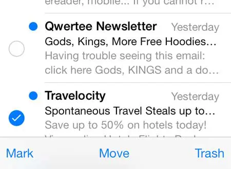 Étape 4 : Touchez le cercle à gauche de l'e-mail que vous souhaitez supprimer, puis touchez lePoubellebouton dans le coin inférieur droit de l’écran.