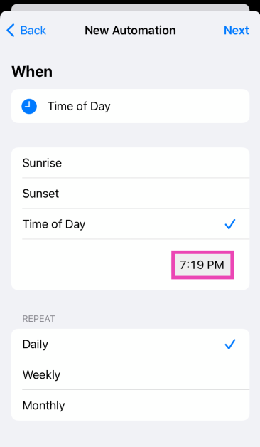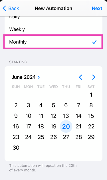 Étape 5 :Appuyez surMensuelet sélectionnez ledatesur lequel vous souhaitez envoyer le message. Il faut savoir que l'application Raccourcis automatisera cette action mensuellement, alors n'oubliez pas desupprimercette automatisation une fois son objectif atteint.