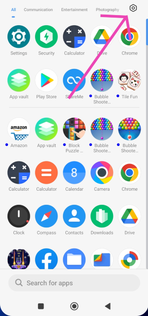 Étape 1 :Accédez au tiroir d'applications et appuyez sur le boutonicône des paramètresdans le coin supérieur droit de l'écran.