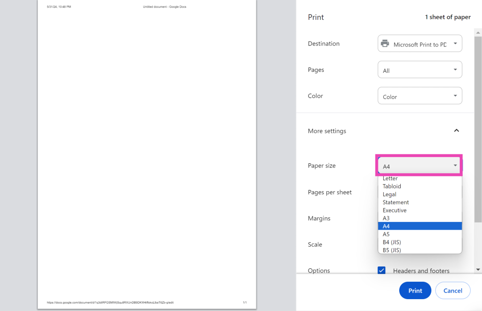 Si vous n’avez plus de papier au format A4 et que vous souhaitez imprimer en urgence un document, ne vous inquiétez pas. La fenêtre d'aperçu avant impression de Google Docs propose une option très pratique pour modifier le format du papier. Vos options incluent Lettre, Tabloïd, Légal, Déclaration, Exécutif, A3, A4, A5, B4 (JIS) et B5 (JIS). Avant d'imprimer le document, assurez-vous que le texte est aligné avec la mise en page.
