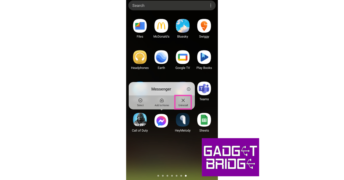 Si vous ne trouvez pas l'application Messenger dans le tiroir d'applications, accédez àParamètres> Applications> Messengeret appuyez sur Désinstaller.