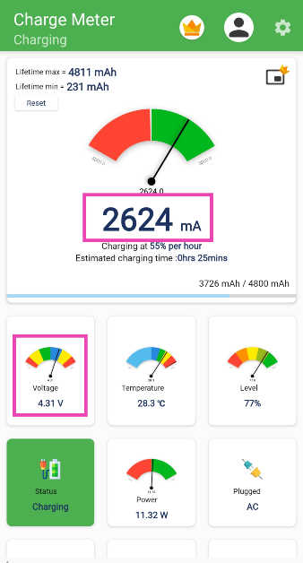 Étape 3 : Multiplierleactuelaffiché dansmAen haut de l'écran par letensionpour obtenir la vitesse de chargemilliwatts(mW). La tension sera mentionnée sur le même écran.