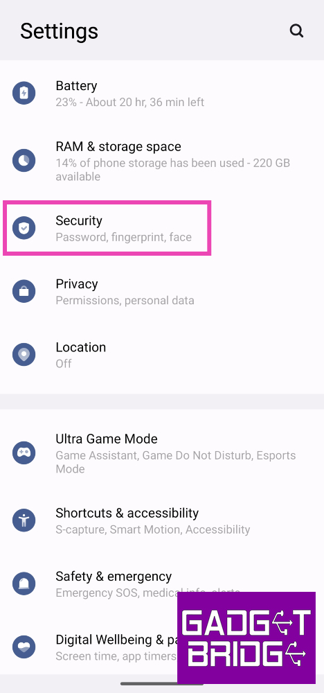 Étape 1 :Aller àParamètreset sélectionnezSécurité.