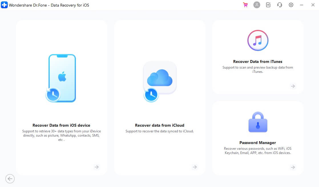 Dr.Fone – Récupération de données (iOS)est un autre logiciel populaire de récupération de photos sur iPhone. Avec son interface conviviale et ses fonctionnalités de récupération complètes, il peut récupérer des photos perdues depuis votre iPhone, une sauvegarde iTunes ou une sauvegarde iCloud.