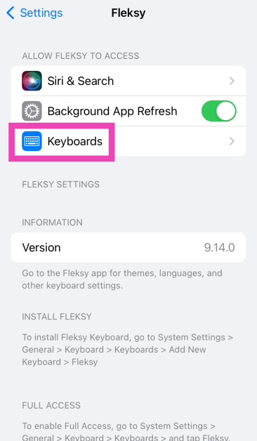 Étape 2 : Lancementl'application Fleksy. Il vous redirigera versparamètres système. Appuyez surClaviers.