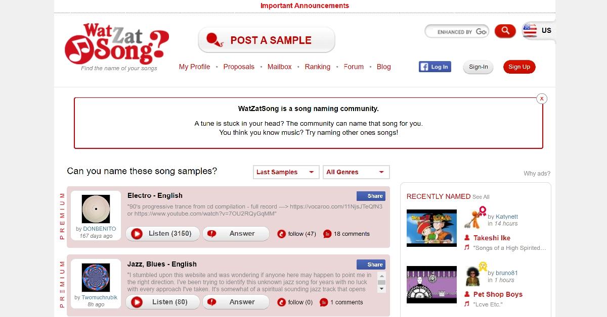 WatZatChansonest une communauté de plus de 400 000 personnes dédiées à la recherche des chansons qui vous restent en tête. Pour publier un extrait de la chanson, vous devrez d’abord vous inscrire. Avec un groupe d’utilisateurs diversifié, rechercher des chansons dans des langues autres que l’anglais devient vraiment simple. Après avoir trouvé la correspondance correcte pour votre requête, vous pouvez également rester et aider les autres utilisateurs avec leurs demandes. WatZatSong est également un endroit idéal pour discuter de tout ce qui touche à la musique. Ses forums sont soigneusement divisés en différents genres de chansons. Une fois que vous avez deviné correctement une chanson, vous recevez des points. Les utilisateurs avec le plus de correspondances sont classés sur le site Web.