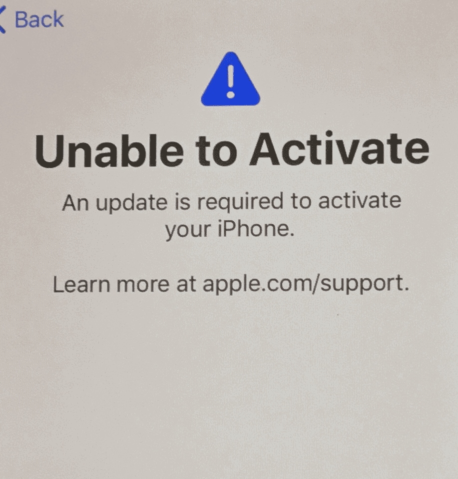 Apple/iOS utilisent couramment le symbole pour attirer votre attention sur une erreur sur votre téléphone. Parfois, vous le verrez lorsque votre téléphone ne parvient pas à être activé au-dessus de l'avertissement « Impossible d'activer ». Dans ce cas, lisez l'avertissement sous l'icône pour savoir à quoi il fait spécifiquement référence et agissez pour résoudre l'erreur.