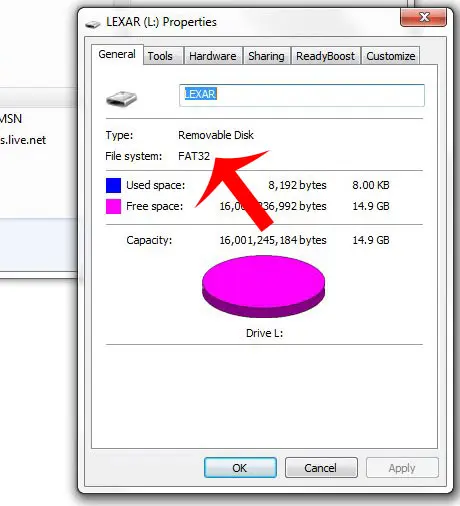 Dans l'image d'exemple ci-dessous, le format du lecteur flash est FAT32.
