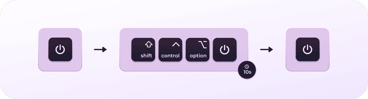 - Si vous possédez un Mac Intel avec une puce de sécurité T2, maintenez les trois touches enfoncées pendant 7 secondes. Ensuite, maintenez enfoncé le bouton d’alimentation et maintenez les quatre touches enfoncées pendant encore 7 secondes. Relâchez les touches et appuyez normalement sur le bouton d'alimentation.