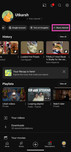 Étape 3 :Faites défiler les options sous le nom de votre profil et sélectionnezPartager la chaîne.