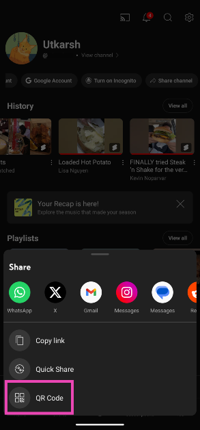 Accédez à YouTube, sélectionnezVous>Partager la chaîne>Code QR, et enregistrez le code sur votre téléphone.