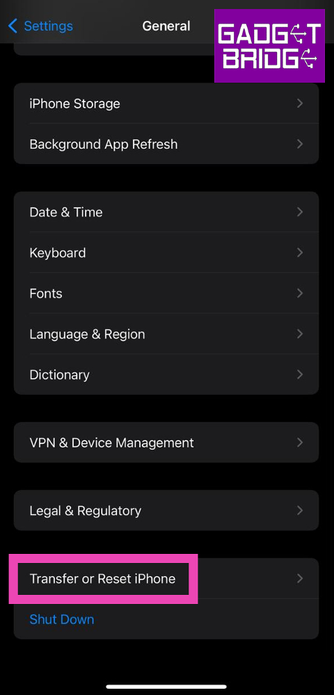 Étape 2 :Faites défiler vers le bas et sélectionnezTransférer ou réinitialiser l'iPhone.
